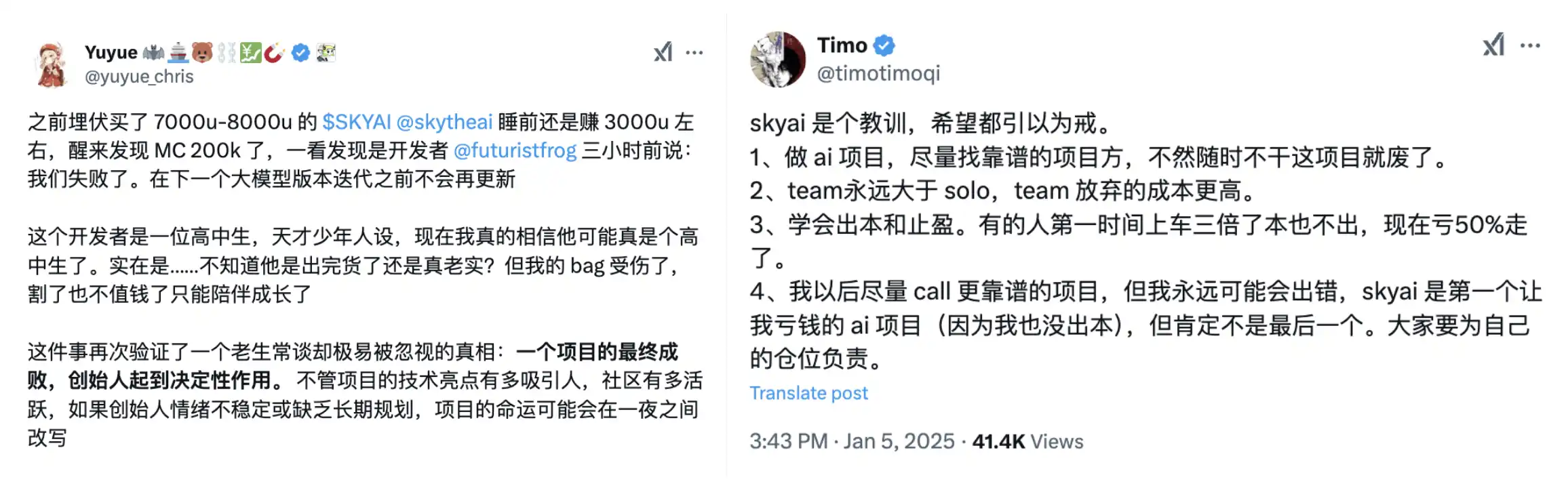 导致这一情况发生的原因是 SKYAI 的开发者 Bob(@futuristfrog) 1 月 5 日称自己的实验失败了,「Bad news. I have failed」。随之 SKYAI 瀑布式砸穿,让许多此前十分看好这个项目的投资人直言要找靠谱项目方,称创始人对一个项目起着决定性作用。