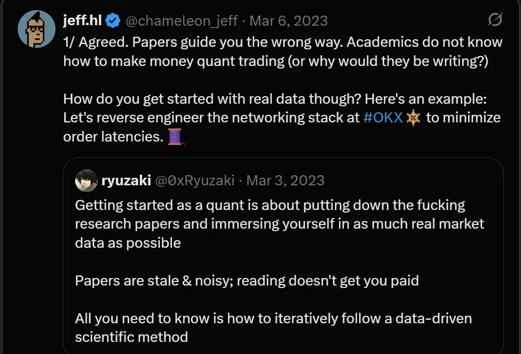但 Jeff 选择了另一种方式。他通过持续输出深度技术内容,积累了最初的用户基础。他的内容涵盖高频交易策略、流动性机制、交易所运作、行业评论和法律洞察等。到了 2023 年 3 月,Jeff 几乎每天都会发一条高质量的技术长推。