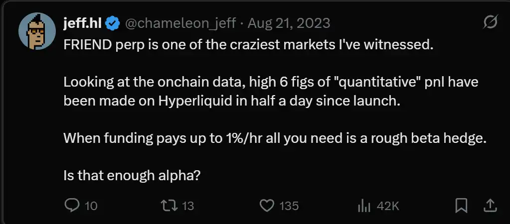 很多人说 Hyperliquid 没有营销团队,听起来好像是轻描淡写。但事实是,Jeff 在产品上线前后的投入,比任何营销团队都更拼。他本人就是整个营销团队。