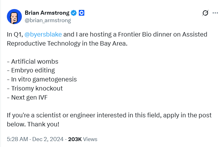 2024 年 12 月,Armstrong 在 X 上宣布,他和投资者 Blake Byers 准备与致力于“人工子宫”、“胚胎编辑”和“下一代试管授精”的创业者会面。双方曾共同创办 NewLimit,一家通过表观遗传重编程延长人类健康寿命的公司,目前已获得近 3 亿美元的注资。Byers 曾表示,全球 GDP 的很大一部分应该用于“永生”研究,包括生物技术方法和将人类思维上传到计算机的方法。