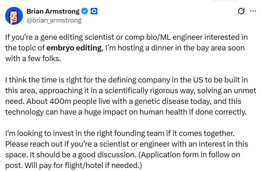 日前,亿万富翁、加密货币交易所 Coinbase 的首席执行官 Brian Armstrong 表示,他准备投资一家专注于人类胚胎基因编辑的美国初创公司。