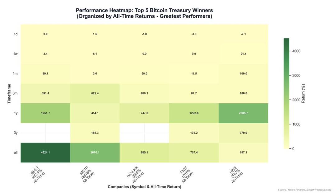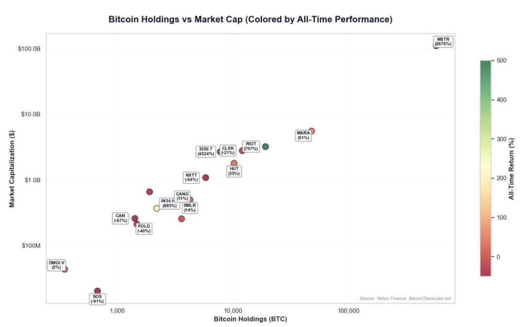 注意:中位数回报显著低于均值,表明极端值拉高了整体平均水平。2020-2025 年,比特币跑赢多数资产类别,是这些公司回报高的核心驱动因素。