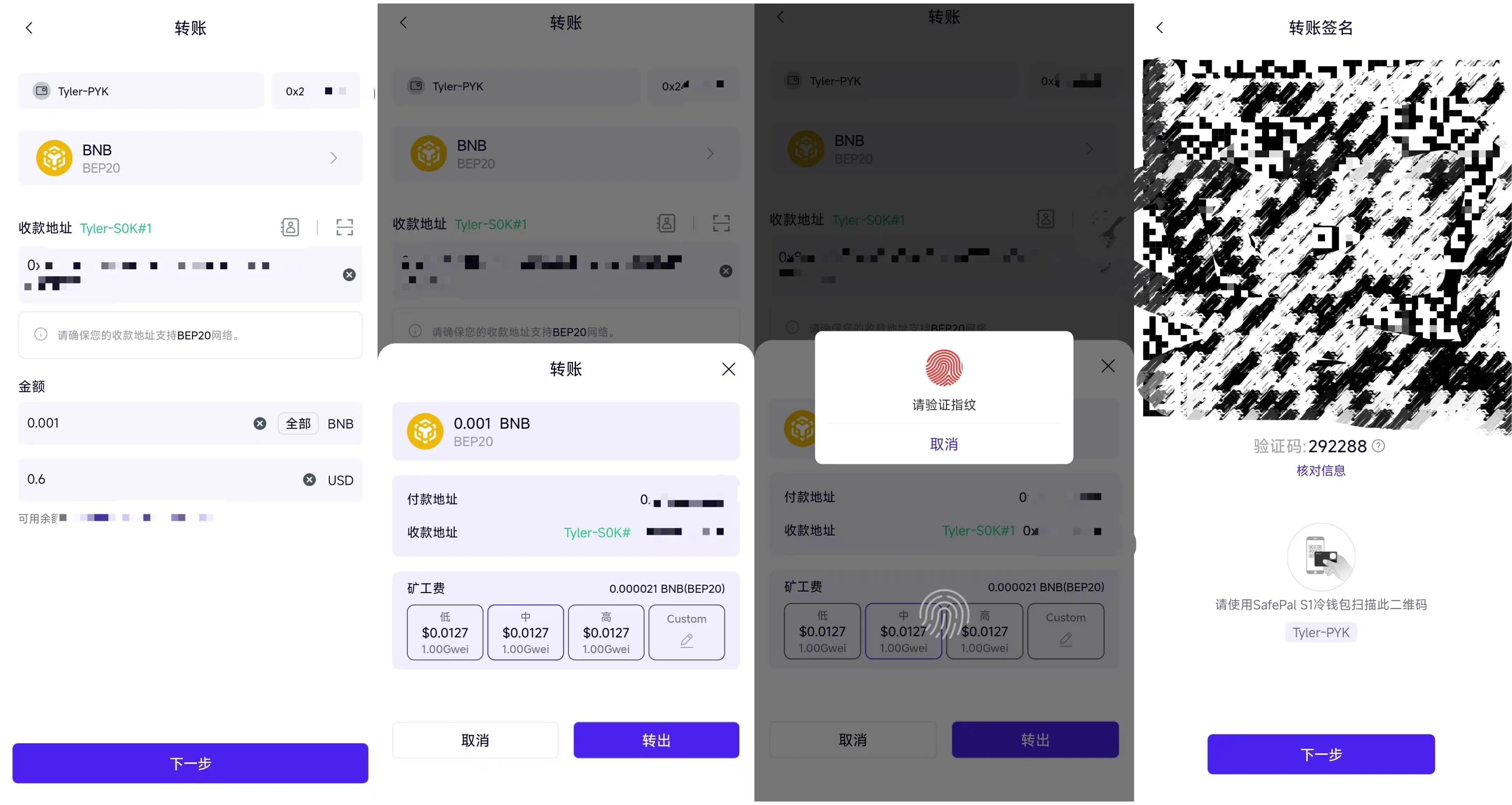 发起转账操作:在 SafePal App 中选择付款钱包(即绑定 X1 的账户),填写币种(如 BNB)、收款地址、金额,点击「下一步」;