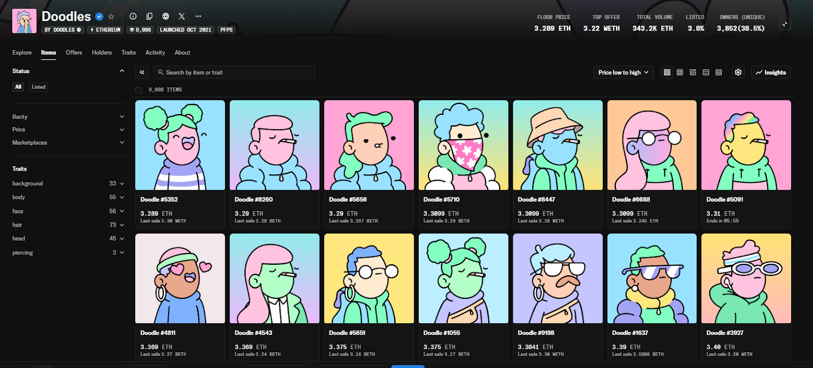 2021 年 10 月,由加拿大插画师 Scott Martin(Burnt Toast)创作的 10,000 个色彩明快的卡通头像登陆以太坊。这些被命名为 Doodles 的 NFT,凭借独特的「儿童简笔画」风格迅速破圈,地板价飙升至 5 ETH 以上,跻身「蓝筹俱乐部」。
