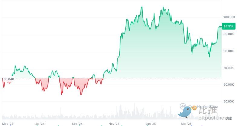 比特币较 1 月 20 日特朗普就职典礼前一天的水平下跌超过 10%,那天比特币价格创下了 109,225 美元的历史新高。道琼斯市场数据显示,本月早些时候,受关税担忧的影响,比特币与其他风险资产一起受到冲击,在 4 月 7 日跌至 74,500 美元以下,截至本文撰写时,又反弹至 94,500 美元左右。