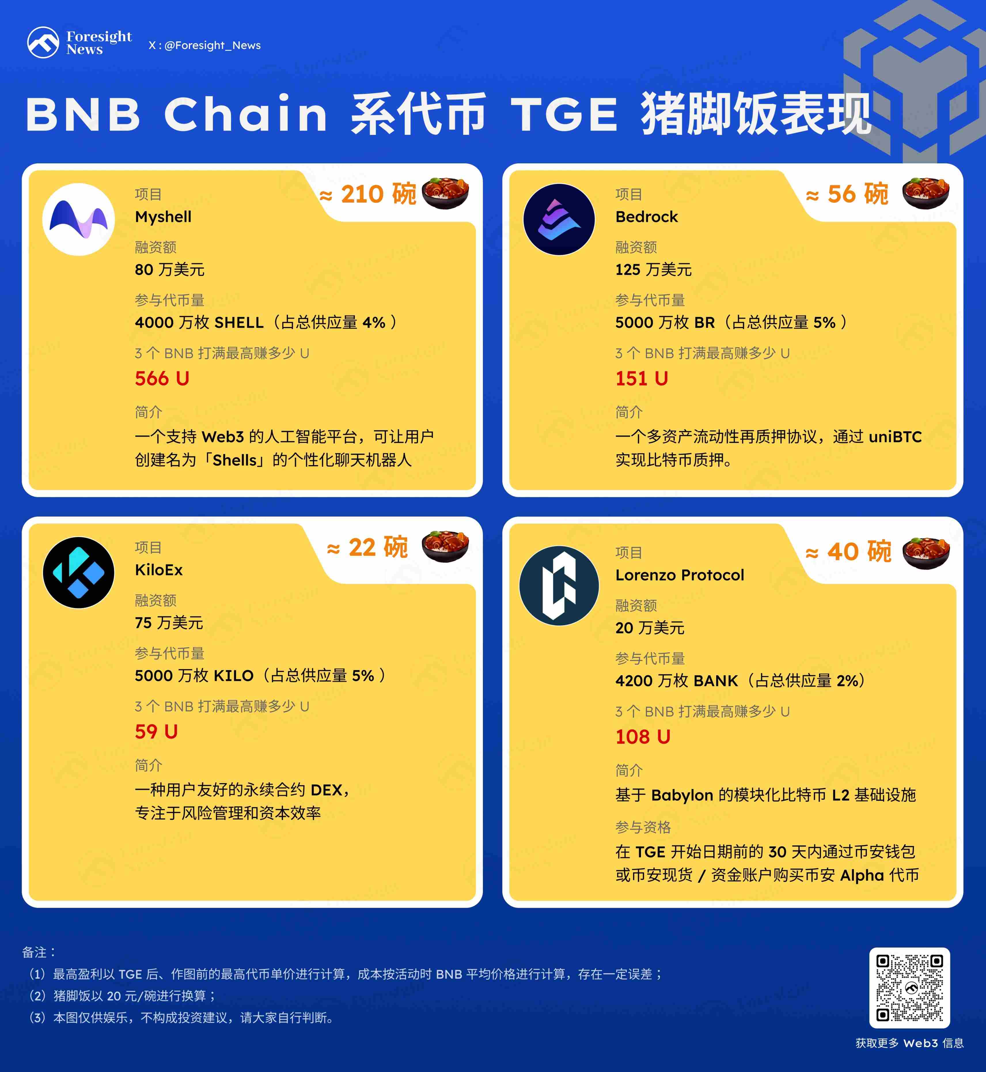 BNB 在币安上的实用性进一步增强了其吸引力。用户可使用 BNB 支付交易费用(比如合约使用 BNB 享受九折手续费),参与启动池(launchpool)和参与币安钱包独家 TGE 等,而近期币安钱包独家 TGE 的频繁上线,让一众小伙伴在震荡下跌的低谷中领到了温暖的「猪脚饭」。其中,BNB Chain 系项目的代币均表现亮眼。据统计,近期币安钱包上线的 12 个独家 TGE 项目中,超 30% 为 BNB Chain 项目。例如,去中心化交易所 KiloEx、比特币 L2 基础设施 Lorenzo Network 等,均是 BNB MVB 前几季的明星成员。