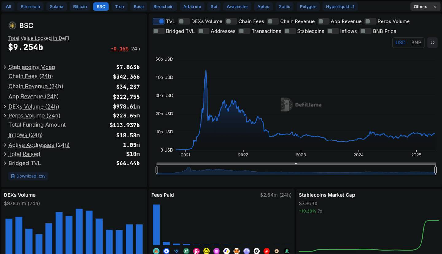 2025 年第一季度,BNB Chain 收入 7080 万美元,环比增长 58.1%,DEX(去中心化交易所)交易量激增 79.3%。BNB Chain 整体在 2025 年 2 月迎来生态大爆发,凭借 CZ 和币安的海量资源支持,迅速接棒 Solana,成为链上生态竞争的佼佼者。BSC 日活跃地址一度稳定在 100 万以上,链上合约部署量更是雨后春笋,达 25 万之多,创多季度新高。在第一季度中,BNB Chain 有多周的交易量位列榜首,链上流动性的活水涌动。2 月 13 日,受 TST 刺激,PancakeSwap 在 24 小时内交易量为 30 亿美元,过去一周内交易量达 200 亿美元。而 BNB Chain 的 TVL 从 2024 年 9 月的 62.6 亿美元增长至 2025 年 4 月 29 日的 92.5 亿美元,增长率达 31.8% 。