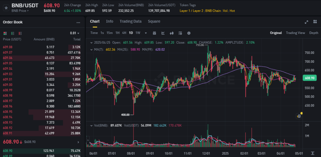 截至 2025 年 4 月中旬,据 CoinMarketCap 数据显示,BNB 价格稳定在 610 美元附近,24 小时交易量高达 16.9 亿美元。在 2025 年第一季度加密市场的整体回调中,BNB 的价格展现出了极强的韧性,历史高点为 2024 年 12 月 4 日的 793.86 美元,而本次回调低点为 500 美元,下降幅度为 37.1%,在主流币中表现仅次于 BTC(-32.1%),大幅优于 ETH(-66.3%),SOL(-67.8%),XRP(-52.6%)。