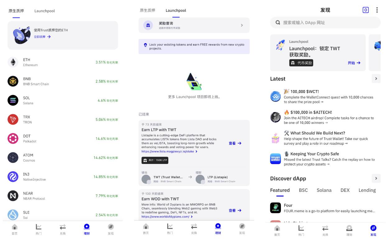 Trust Wallet的理财功能,主打“原生质押 链上入口”。