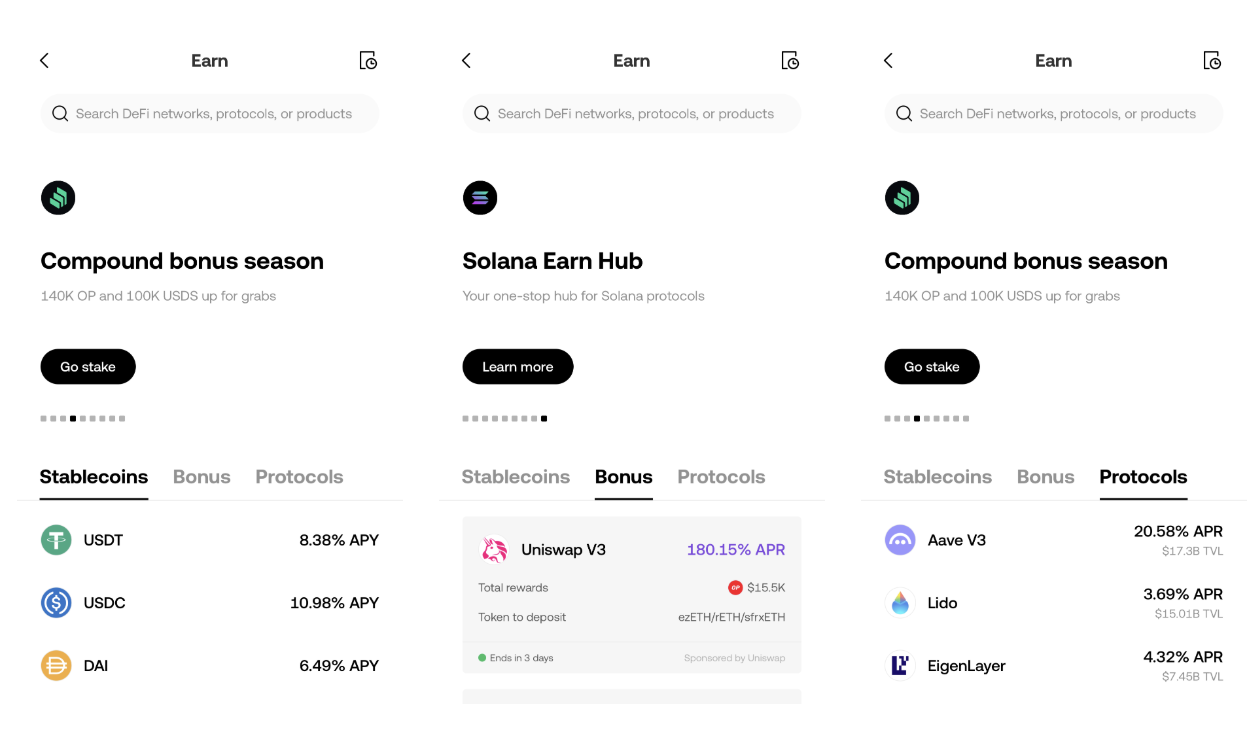 当前,很多主流钱包已经将链上理财功能直接集成到产品里,不需要跳转dApp,不用查合约地址,一键就能参与理财产品。不过,不同类型的钱包,其产品功能也具有一定的差异。