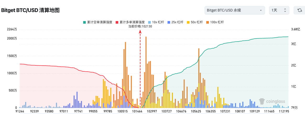 3、Bitget BTC/USDT清算地图显示,当前清算压力集中于多头关键支撑位下方,空头清算分布较广,短线市场波动增强,关注支撑稳固与反弹迹象;