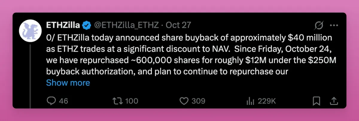 ETF DAT 的组合使 ETH 持有者群体更加机构化,但尚不清楚他们是否更倾向于长期增长。主要的担忧点是 ETHZilla 宣布出售 ETH 以回购其股份。这并非恐慌的理由,但已树立了一个先例。