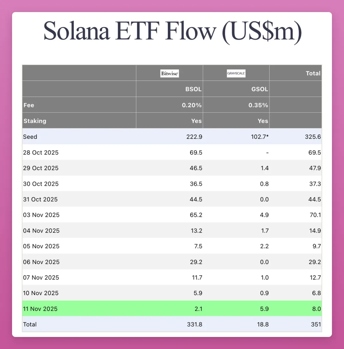 SOL 正在进入与 ETH 相同的机构化阶段。上个月,CT 上出现了 SOL 现货 ETF,而且没有任何炒作。资金流入量虽然不是特别高(总计 3.51 亿美元),但每天都有正流入。