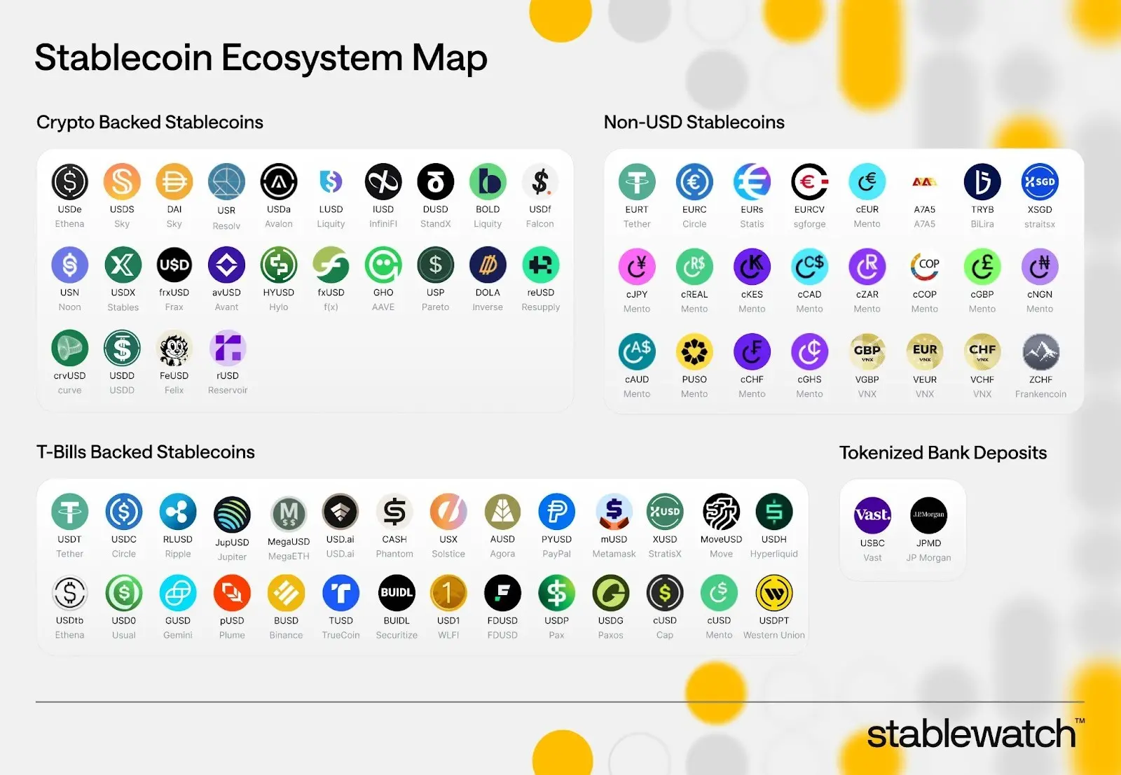 许多稳定币宣称与美元 1:1 挂钩,但背后的抵押资产与发行机制却天差地别。Stablewatch 在 11 月 4 日发布的《Stablecoin Ecosystem Map》,将市场上的稳定币分为四大类别:
