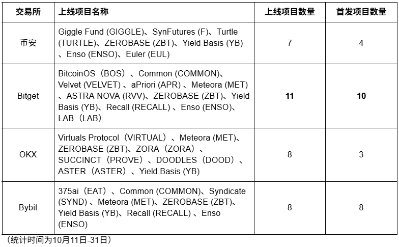从数据层面看,2025 年 10 月 11 日至 31 日,四大交易所共上线项目数量超过 30 个,创下年内新高。这不仅体现了交易所恢复信心的速度,更揭示出各平台差异化的战略方向。