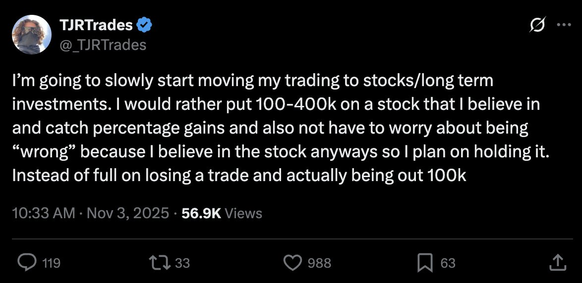 在写这篇文章时,我看到了 TJR 的一条推文,它与我的观点不谋而合。我将短周期的交易风格(无论是股票还是加密货币)视为一种追求快钱的方式,也是一种粗糙的赚钱手段。最近的市场波动(可以说是“市场暴击”)让许多人大开眼界,我们开始看到这些短期游戏的结局。过去3年多的时间里,我们一直处于一个“极左曲线”市场中(注:意指市场极端化,甚至“无脑”操作都能获利),那些“菜鸟”投资者往往表现得比经验丰富的投资者更好。但或许现在是时候让真正有实力的人重新主导市场了?像 Julian Petroulas 那样的模式?对于那些尚未成功、资金规模还不足以实现大收益的人来说,这种趋势可能很糟糕。但整体来看,我感受到的氛围是市场正在朝这个方向发展。