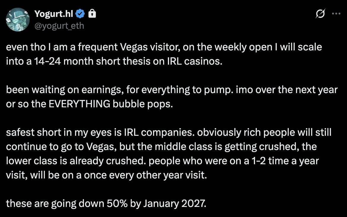 像 Hype、Robinhood 和 Polymarket 这样的合法产品和团队,我认为仍然会是大赢家——而且是赢得漂亮的那种。真正让这些“好人”脱颖而出的,是他们的意图明确:与那些只想掏空你钱包的项目完全不同。虽然 Robinhood 因 GME 事件曾备受批评,但现在看起来他们已经改进了自己的行为。而 Hype 可以被视为链上版的 Robinhood(尽管这个比喻有些宽泛)。至于 Polymarket,它似乎正在向传统体育菠菜的“旧钱”发起挑战。
