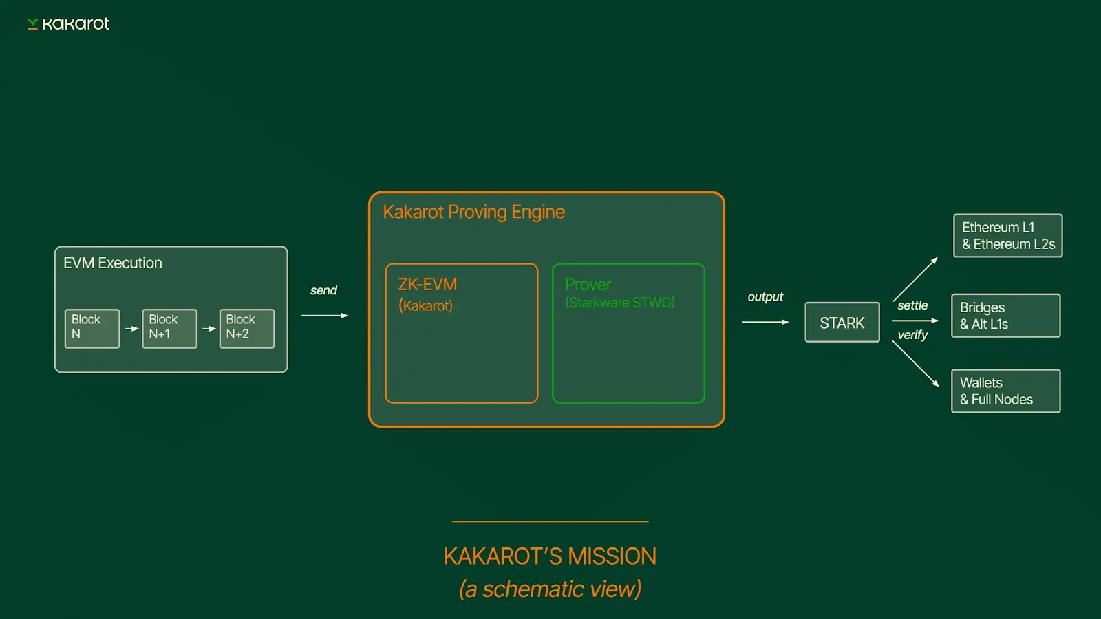 Kakarot 能够为所有与以太坊兼容的链(Ethereum-equivalent chains)生成零知识证明(ZK Proofs),从而让任意 EVM 链轻松过渡到 零知识架构(ZK),在保障安全性的同时大幅提升可扩展性。