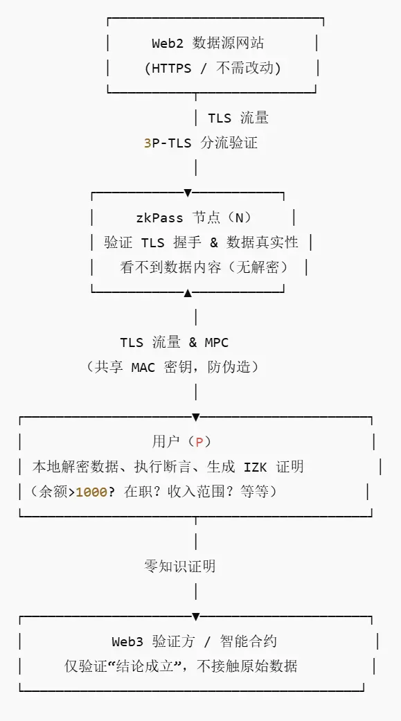 3P-TLS:将 TLS 扩展为三方协议(用户 zkPass 节点 数据源)。节点验证数据真实性但无法解密隐私内容。