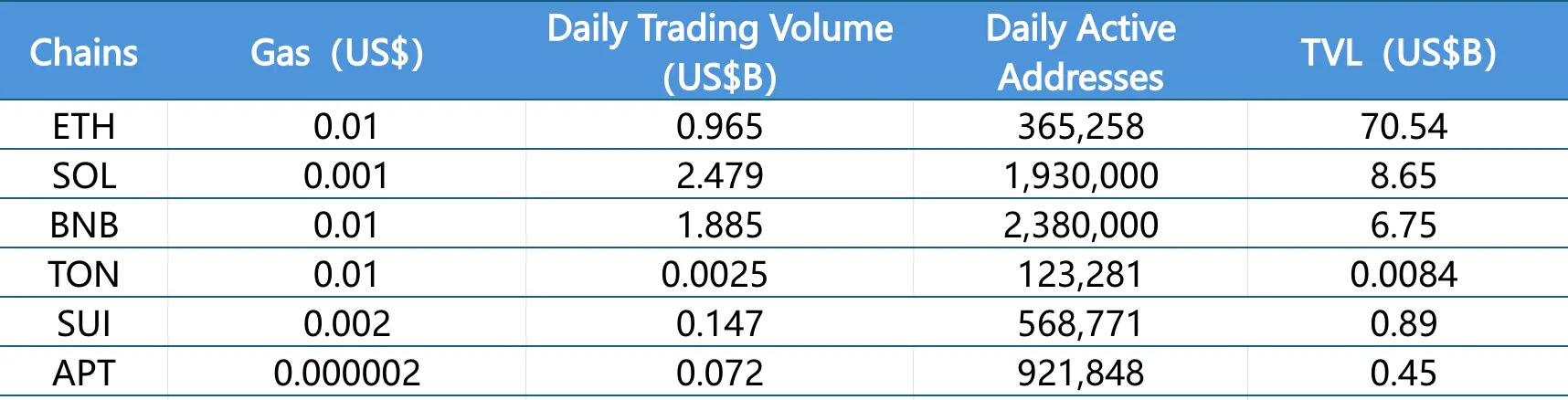 主要从日交易量、日活跃地址、交易费用分析目前主要Layer1含ETH、SOL、BNB、TON、SUI以及APTOS的相关数据。