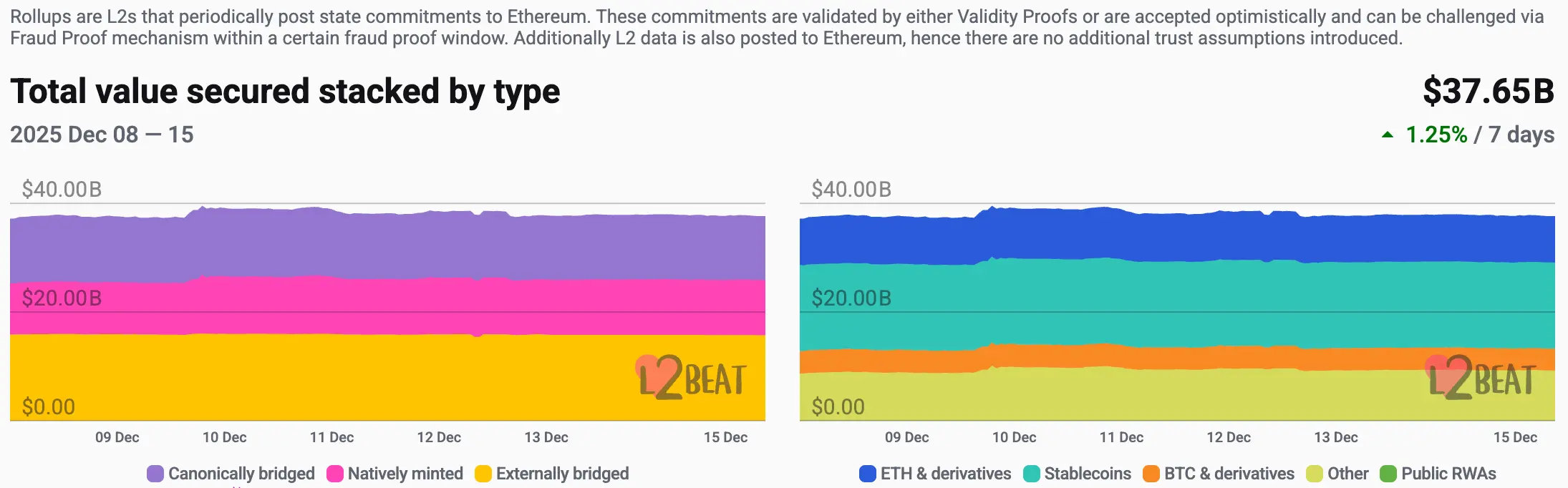 据L2Beat数据显示,以太坊 Layer 2总TVL为376.5亿美元,本周较上周($371.7亿)整体涨幅为1.4%。