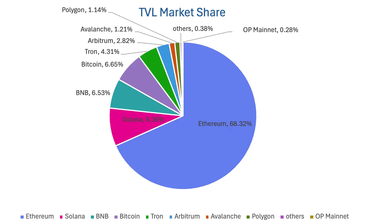 按公链进行划分,其中TVL最高的三条公链分别是Ethereum链,占比68.32%;Solana链,占比8.36%;BNB Chain,占比6.53%。