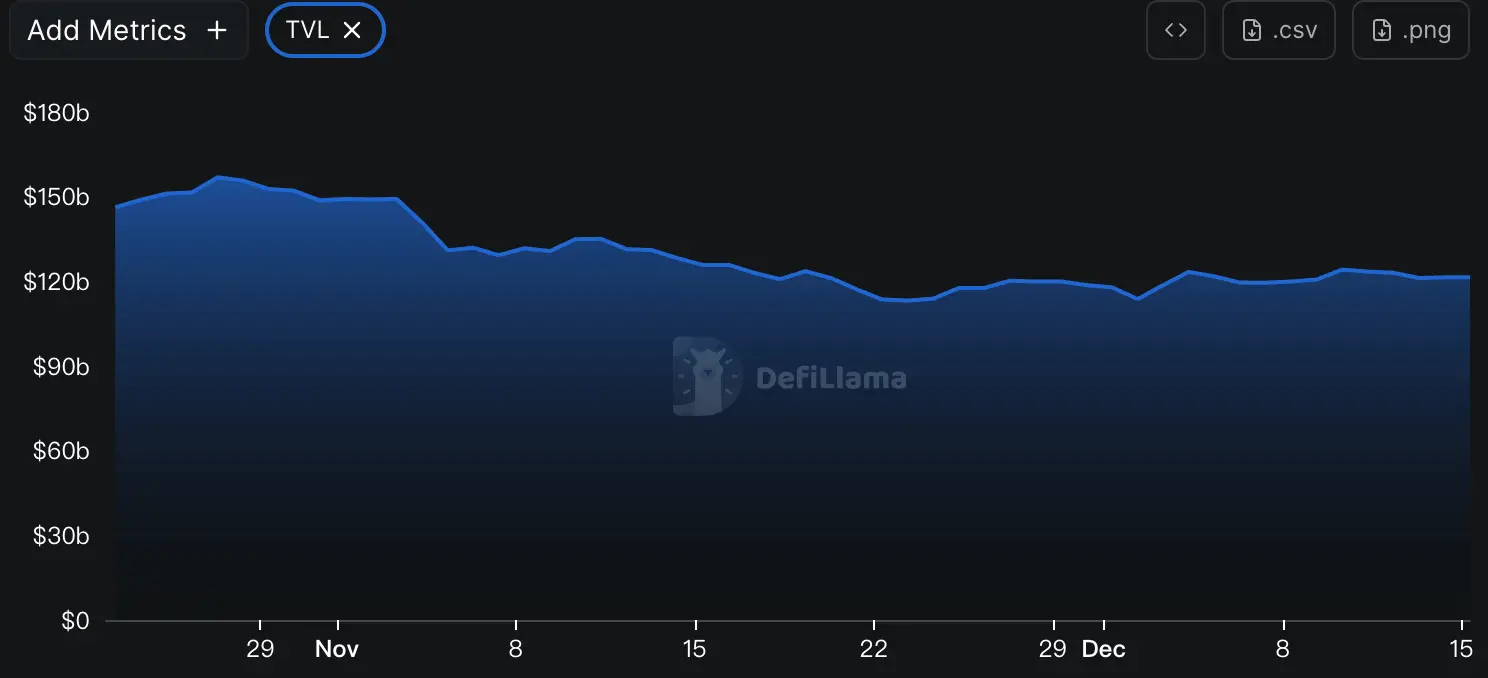 据DeFiLlama的数据,本周DeFi总TVL为$1,214亿,较上周1,208亿,上升约0.49%。