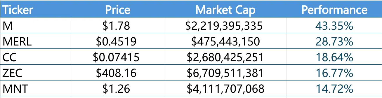 1.本周涨幅前五的VC币和Meme币