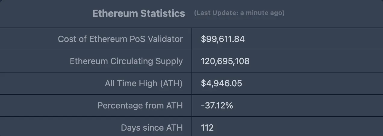 ETHUSD :现价$3,114.30,历史最高价$4,878.26,距最高价跌幅约37.12%