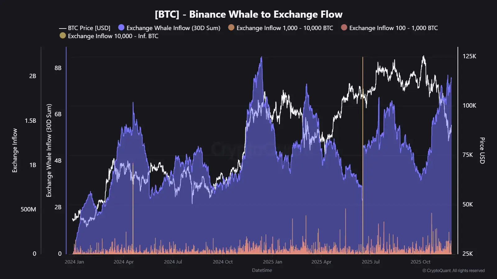 CryptoQuant 数据显示,过去 30 天内,流入币安的 BTC 巨鲸资金规模已达到 75 亿美元,为一年新高。该资金流入结构与过去高波动行情高度一致,通常意味着: