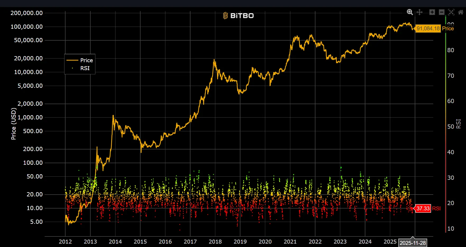 截至本周期末,比特币 14 日 RSI 为 37.33,未触及超卖(RSI<30),较上周40略有下降,但仍处明显弱势区间内。RSI 持续位于 30–45 区间说明市场仍偏弱, 短线超卖压力有所释放,但反弹动能暂不足。