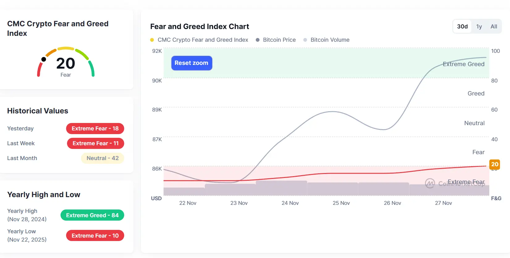 截至11月28日,「恐惧与贪婪指数」约为20点,处于“极度恐惧”区间。