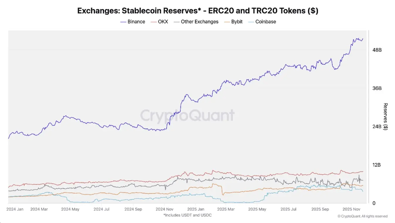 随着行情快速回调,交易所整体资金流入显著上升。币安平台的稳定币储备量本周升至 511 亿美元,创新高,显示市场避险情绪强化。同时,比特币与以太坊的总体资金流入合计约 400 亿美元,其中 Binance 与 Coinbase 的流入最为活跃,反映短期流动性集中向头部机构平台迁移。