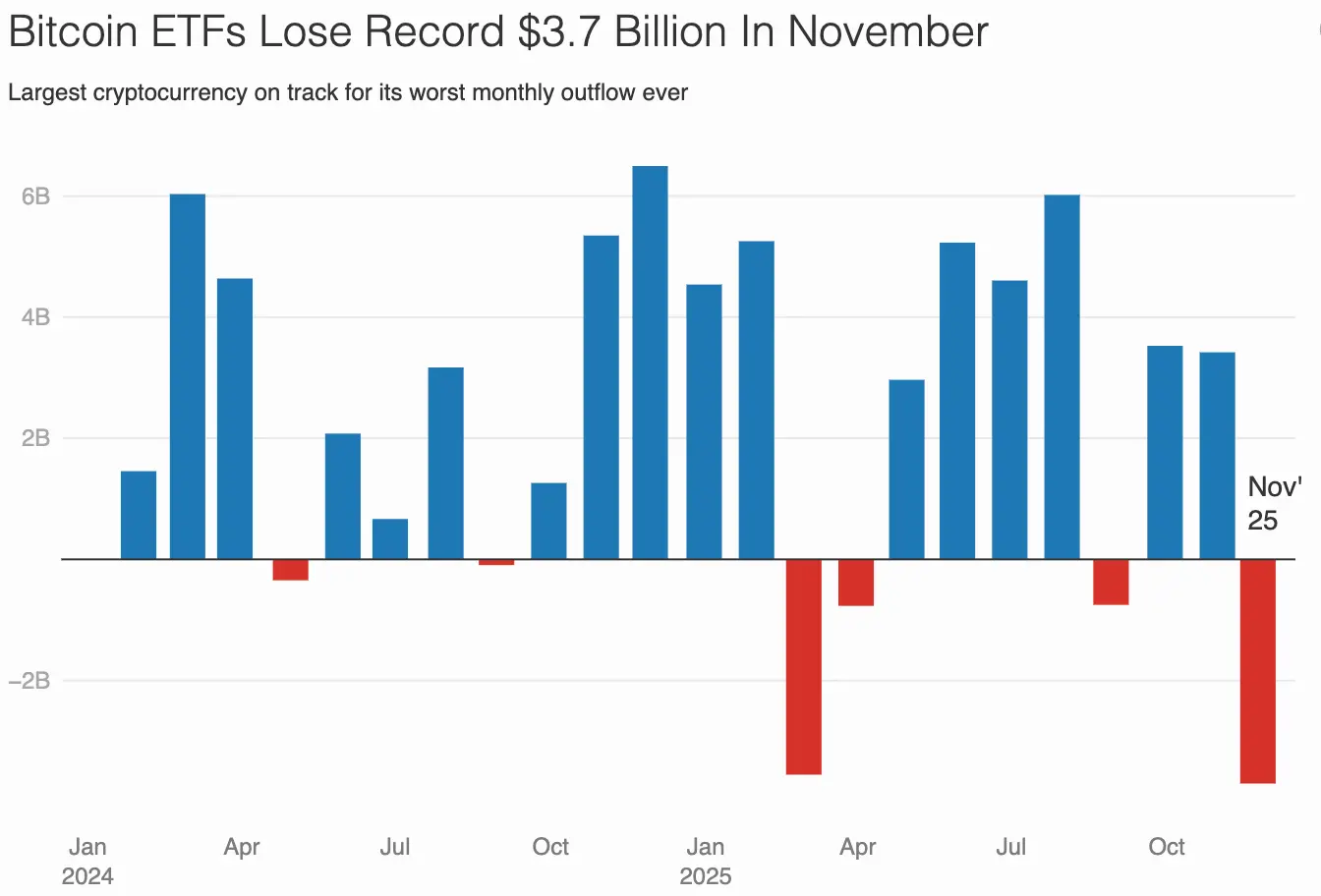 11月26日消息,据福布斯报道,比特币现货 ETF 延续大规模赎回趋势,单月累计净流出已达 37 亿美元,刷新今年 2 月的纪录。受此影响,比特币自 10 月历史高位 12.6 万美元回调超 35%,期间最低触及 8 万美元,为 4 月以来低点。