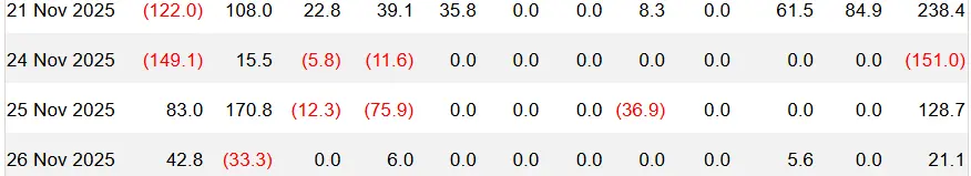 11 月 21 日比特币现货 ETF 合计净流入约 2.384 亿美元,在此前多日连续流出的背景下,资金一度明显回流;但 11 月 24 日短暂出现转为 –1.51 亿美元净流出, 此前 11 月 19 日 BlackRock IBIT 单日创纪录流出 5.23 亿美元、全周美股比特币 ETF 整体转为净赎回的大背景下,机构情绪依然偏向防御 。11 月 25 日与26日,资金再度恢复到小幅净流入, 低位买盘开始重新进入 ETF 渠道,资金结构从“一边倒流出”逐步走向“流出与流入交替”,但整体仍处于震荡博弈阶段。