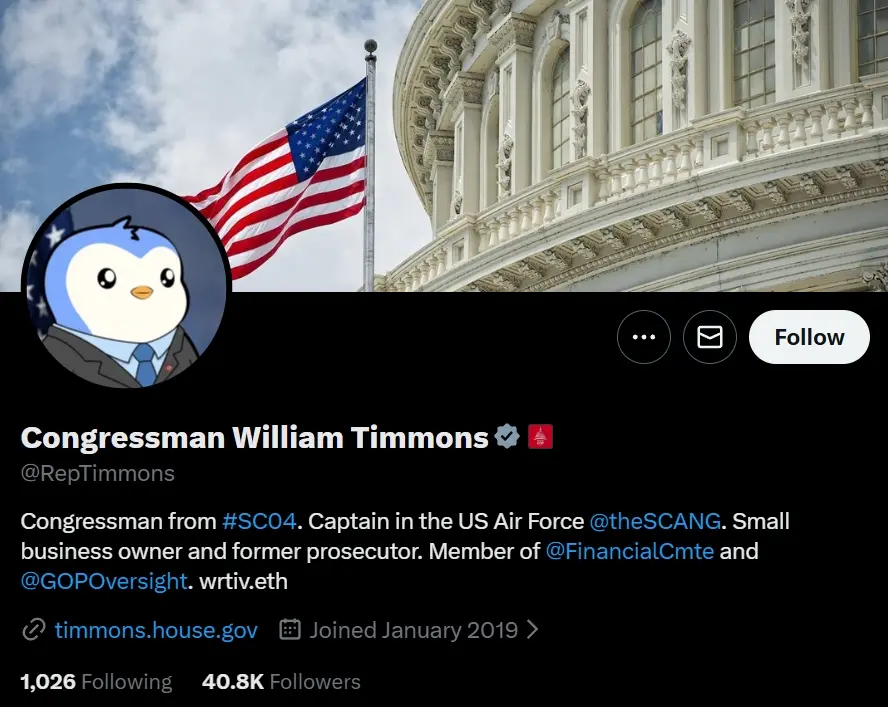 在最近一年里,Pudgy Penguins 这个来自 Web3 世界的 IP 展现了罕见的跨墙能力,成为行业少见的现实级样本。最近,美国国会议员 William Timmons 主动将社交媒体头像换成 Pudgy Penguin 形象,迅速引发全球用户的关注和讨论。这不是简单的名人效应,而是文化认同层面的突破——一个政治人物愿意用 Web3 符号代表自己的公众形象,标志着这个 IP 已经跨越了"加密货币小圈子",开始被主流社会接纳。