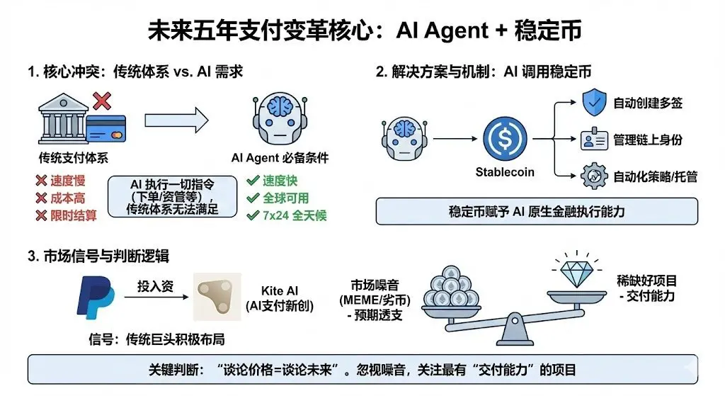 ✍️RWA-Fi、AI 支付、稳定币,是未来 5 年的三条超级主线。不是热点,是地基。RWA,AI,稳定币都在加速Crypto ✖️ 传统金融的融合。RWA 桥接骨架和资产,AI 解决实际效率和执行落地,稳定币是所有创新的底层燃料。