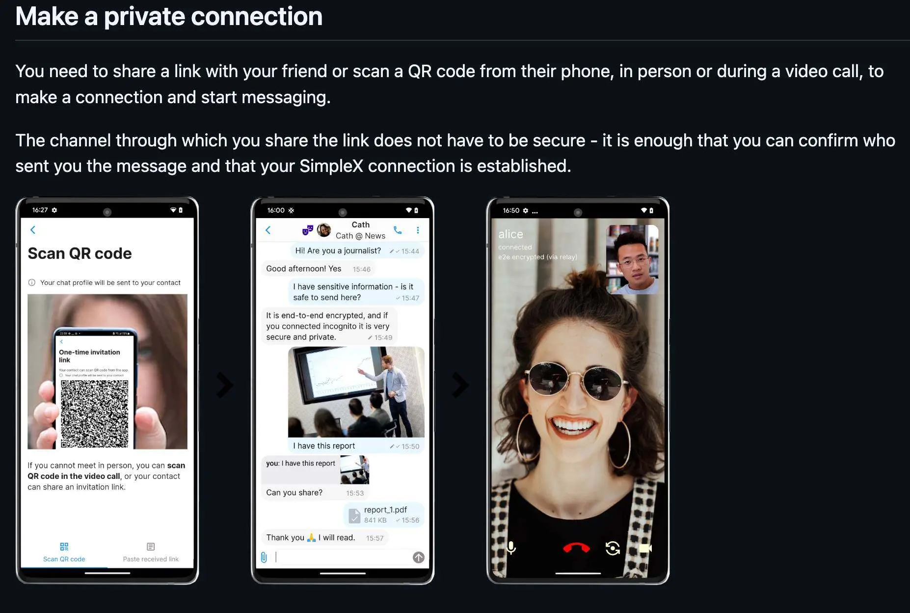 实际体验上,SimpleX 的界面比较简洁,支持文字、语音消息、图片、文件和阅后即焚消息。群聊功能也有,但因为没有中心化的成员列表管理,大型群组的体验不如传统应用。语音通话可用,视频通话还存在一些稳定性问题。