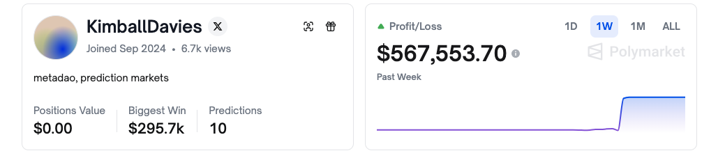 这名交易员名叫 KimballDavies,2024 年 9 月加入 Polymarket,其 slogan 为“metadao, prediction markets”,可能代表着其专门玩 metadao 相关的预测事件。