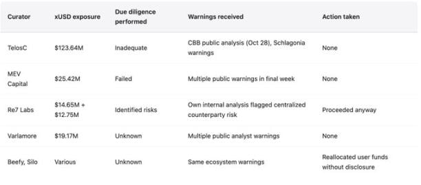 RE7 Labs 的案例极具教育意义。他们在整合 xUSD 前的尽职调查中,已正确识别出「中心化交易对手风险」是隐患。Stream 将风险集中于一个头寸和策略完全不透明的匿名外部基金经理。RE7 Labs 清楚风险,但仍以「用户和网络需求旺盛」为由推进整合。费用收入的诱惑压过了用户资金的风险。当资金损失时,RE7 Labs 仅承受声誉损害,用户却承担了 100% 的财务损失。