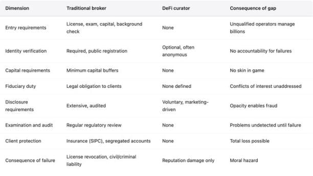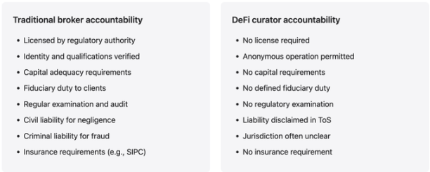 支持这些管理人的协议自称为「中立的基础设施」,从活动中赚取费用,却对活动所产生的风险概不负责。这种立场根本站不住脚。传统金融在经历多次灾难后,早在几十年前就已摒弃了这一观念,因为血的教训表明:赚取费用的中介绝不能完全免责。