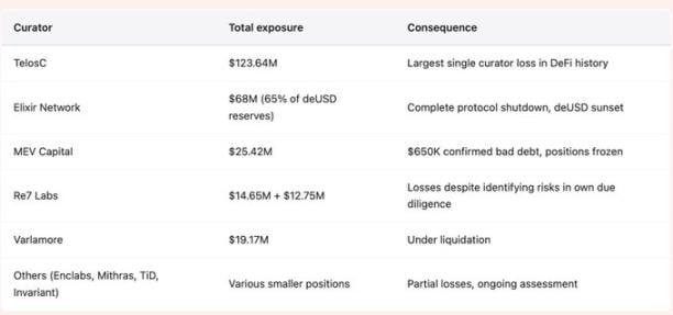 包括 TelosC(1.2364 亿美元)、Elixir(6800 万美元)、MEV Capital(2542 万美元)、Re7 Labs(两个金库共 2740 万美元)在内的多家基金管理人都将用户存款高度集中于单一交易对手。该对手方仅以 190 万美元的真实抵押品,运作着高达 7.6 倍的杠杆。