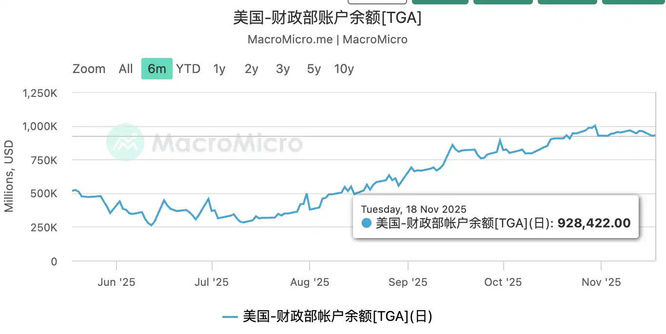 数据显示,从 2025 年 10 月 1 日至 11 月 12 日这 43 天期间,TGA 余额持续累积,到 11 月 14 日达到 9590 亿美元的高点。这个水平远高于财政部通常维持的现金部位,主要是因为政府停摆期间支出受限,加上持续发债筹资,导致现金大量累积在国库账户中。