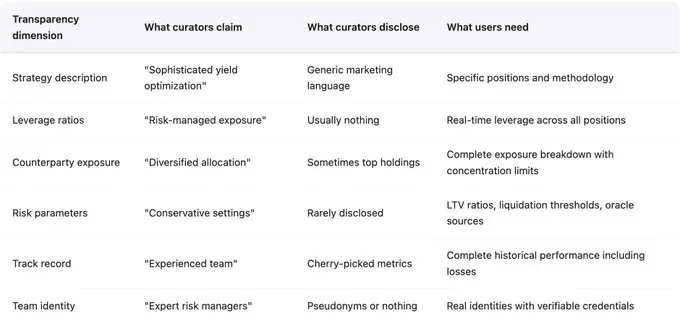 策略本身很少有有意义的披露。风险策划人使用诸如「Delta 中性交易」、「对冲做市」、「优化收益农场」等术语,这些听起来很专业,但无法提供关于实际仓位、杠杆比率、交易对手风险或风险参数的任何洞察。
