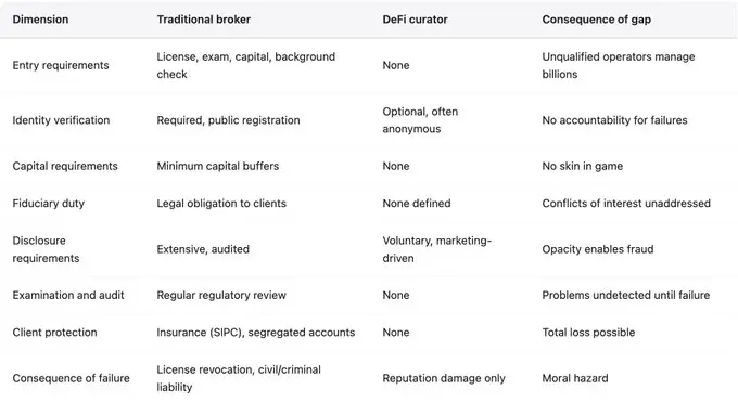 身份披露与问责:许多风险策划人以化名或匿名方式运营。这有时以个人安全或隐私为理由,但直接影响问责。当风险策划人无法被识别时,他们无法因疏忽或欺诈承担法律责任;即使累积失败记录,也无法被排除在运营之外;无法受到专业制裁或声誉惩罚,因为这些惩罚无法追随真实身份。匿名运营消除了在缺乏监管时唯一存在的问责机制。在传统金融中,即使没有监管执法,毁掉客户资金的管理人仍面临民事责任和声誉后果,这些后果会追随其真实身份。而在 DeFi 中,他们两者都不面临。