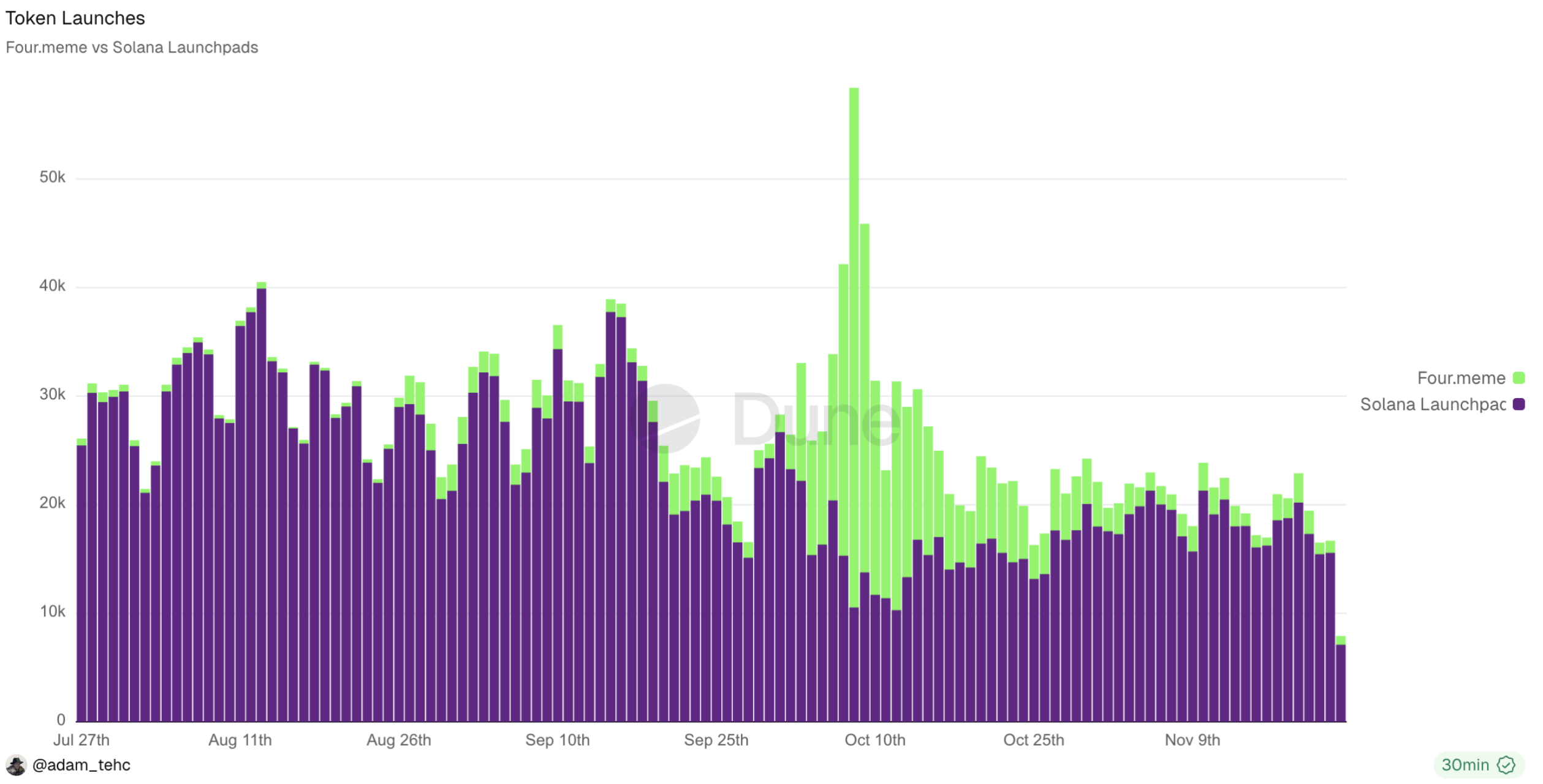 图:Solana和Bsc链上代币发行维持低位