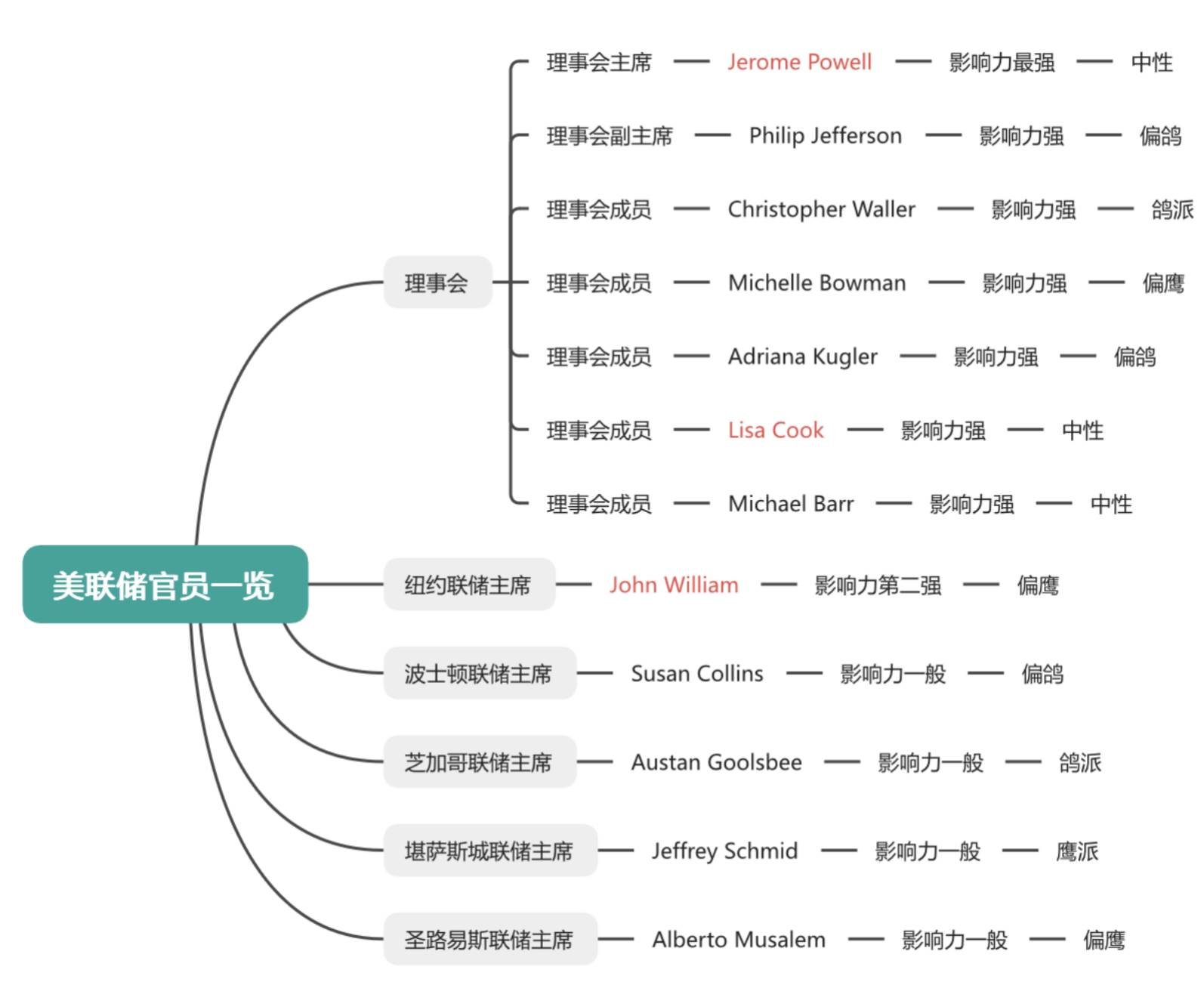 图:美联储现任官员影响力与鹰鸽站位汇总