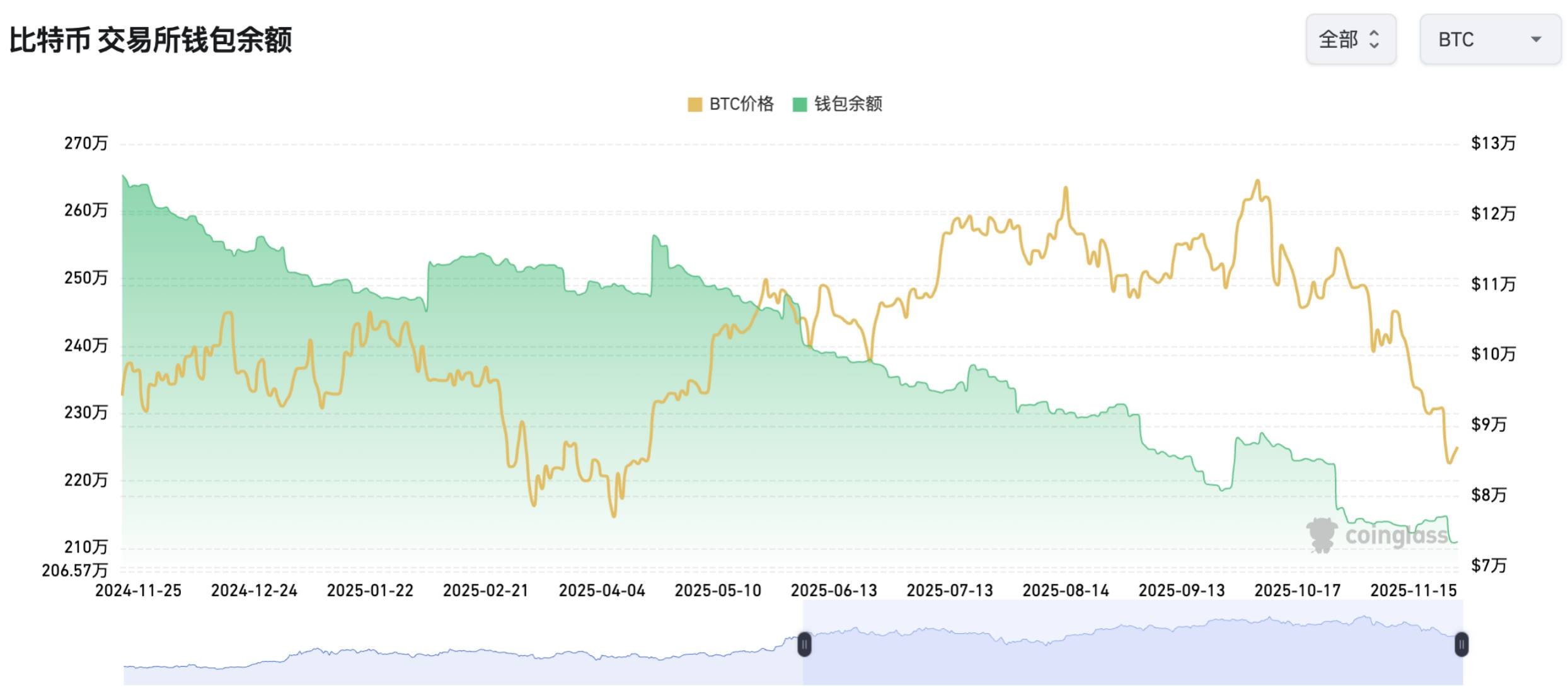 图:BTC交易所余额环比下降1.3%
