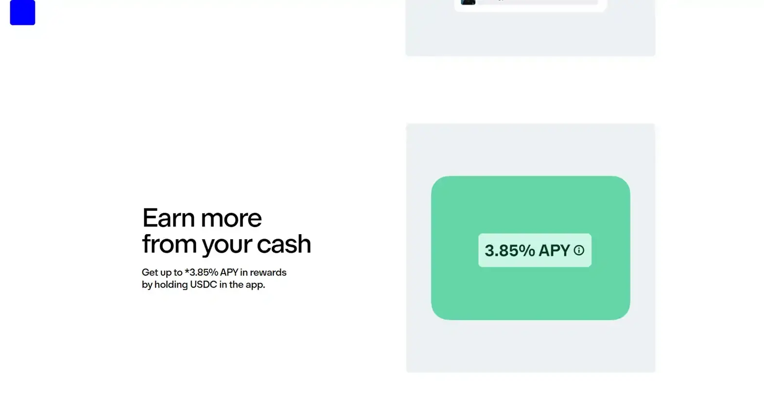 但实际上,这很像是亲自入局为 Base App 打广告。Base App 很像 Coinbase 自家的「支付宝」,它既是 Base 网络的应用枢纽,又涵盖了一个带有创作者经济机制的社交网络,还可以在其上进行代币的交易以及转账,甚至还有「余额宝」——在 Base App 中的 USDC 可以享受到高达 3.85% 的年化收益率。