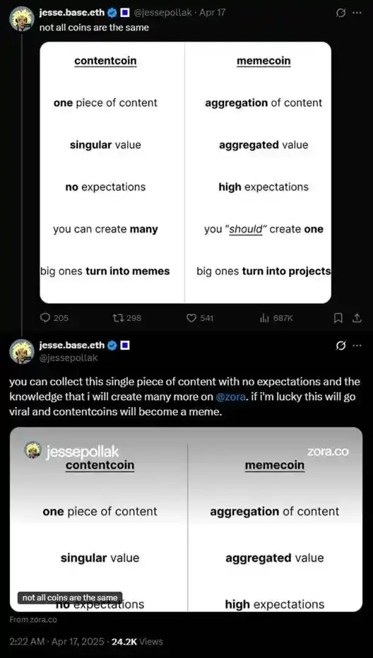 其实,在 Base 官推的这条推文前大约 1 小时,Jesse 还把自己一条关于内容币与 meme 币的区别的推文在 Zora 上发成了币。在那几天,他疯狂分享自己对内容币的观点,而一周后,Zora 发币了。